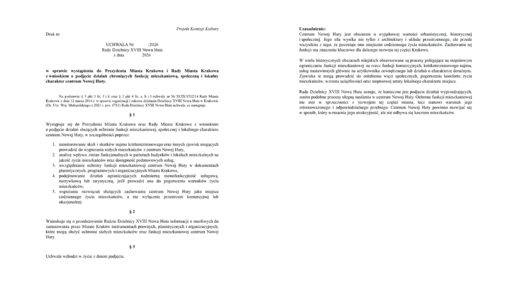 Dlatego turystyka w Nowej Hucie musi iść w parze z drugim hasłem: funkcja mieszkaniowa. Jeśli jedna zacznie pożerać drugą, skończy się jak w centrum Krakowa – pięknie, głośno, dochodowo, ale coraz mniej po ludzku. Ostrzeżenie w tej sprawie płynie dziś nie z publicystyki, ale z oficjalnych miejskich dokumentów dotyczących samego historycznego centrum.